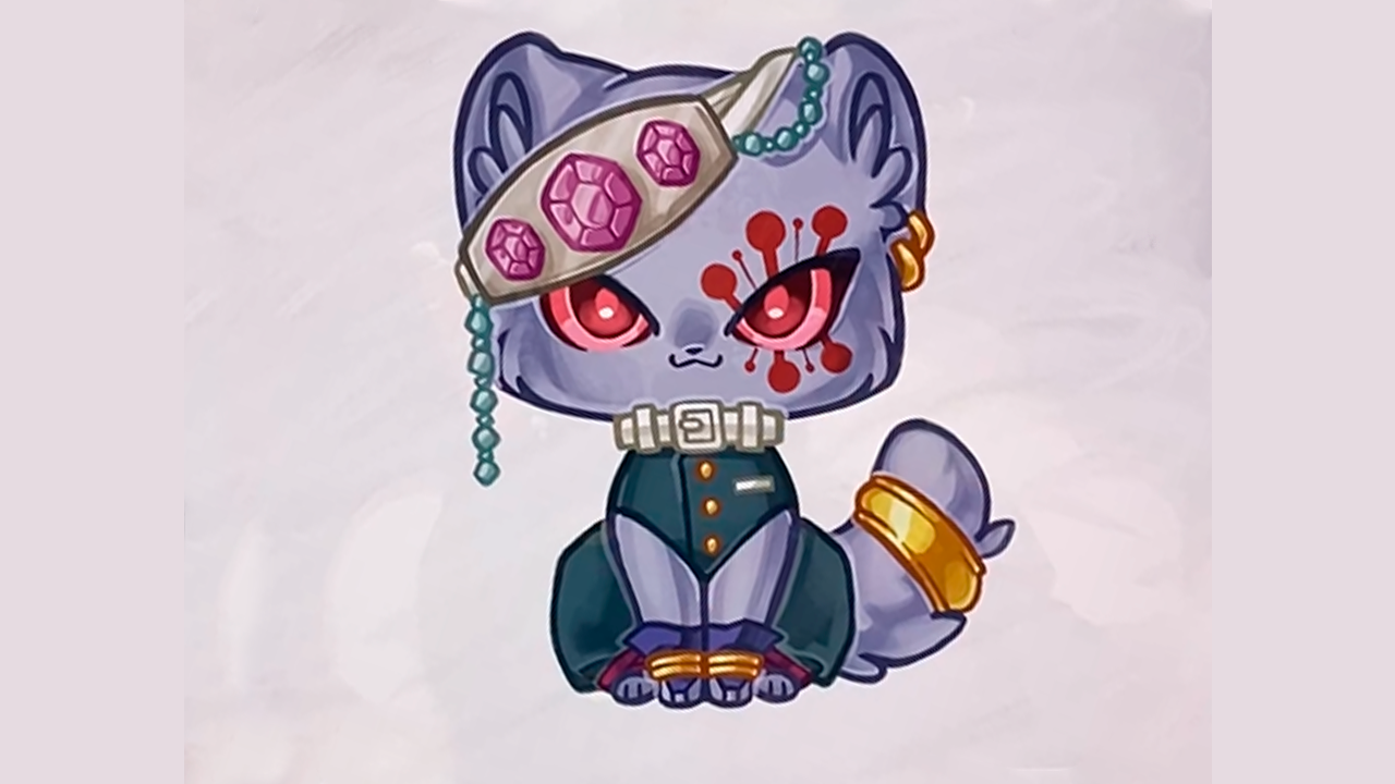 Para el Hashira del Sonido, vemos que Tengen Uzui tendría un pelaje casi púrpura y muy al estilo del vistoso Pilar llevaría su cuerpo envuelto en joyería. Los brazaletes que rodean sus patitas y su cola le dan un toque extra a esta versión.