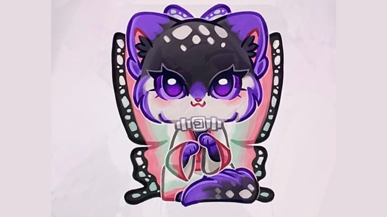 La mirada apacible de la Pilar Insecto se transmite perfecto en esta ilustración. Lo mejor de esta versión de Shinobu, por no mencionar la tierna postura de sus patitas delanteras, es el toque de las enormes alas que se extienden detrás de ella. Este detalle nos hace pensar también que los gatitos son de un tamaño considerablemente pequeño.