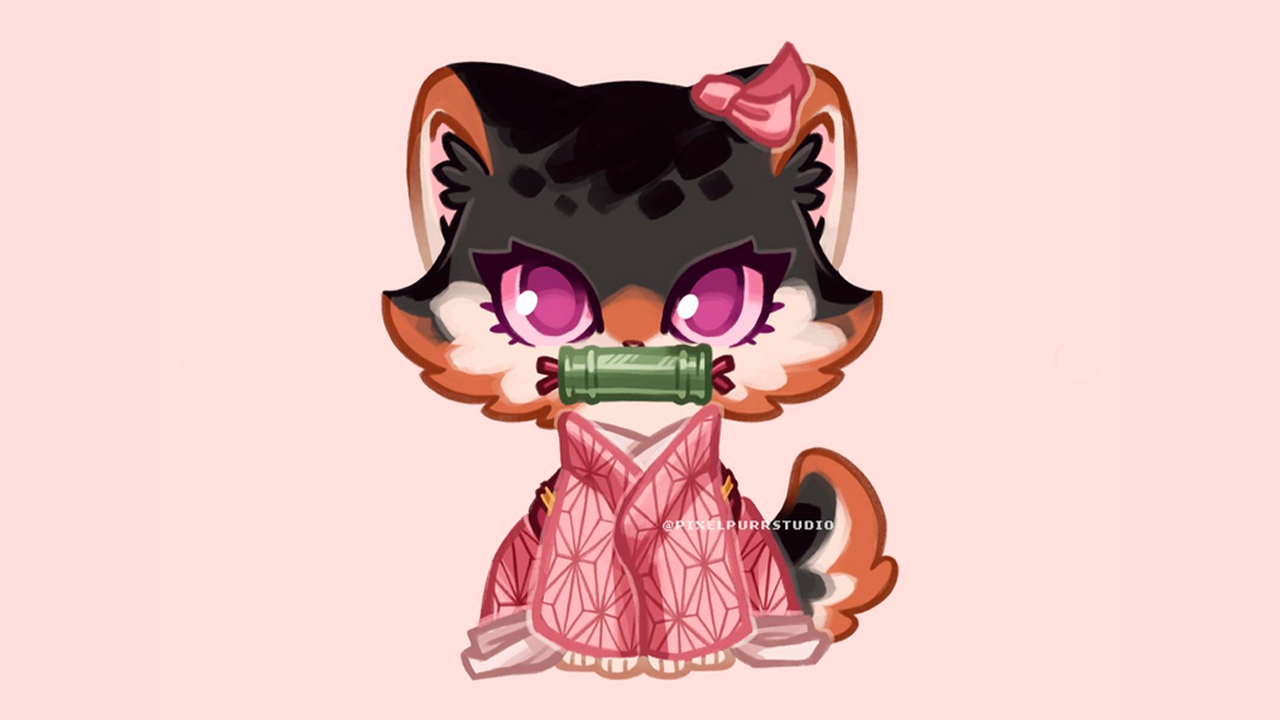 Una de las más tiernas es sin duda la versión gatuna de Nezuko, que ya de por sí en la serie nos ha dado momentos adorables al encoger su tamaño y salir corriendo. Portando su haori rosa, un moño a juego y aún su bambu en la boca, la hermana de Tanjiro fácilmente podría distraer con su ternura a cualquier enemigo hasta mostrar su increíble poder.