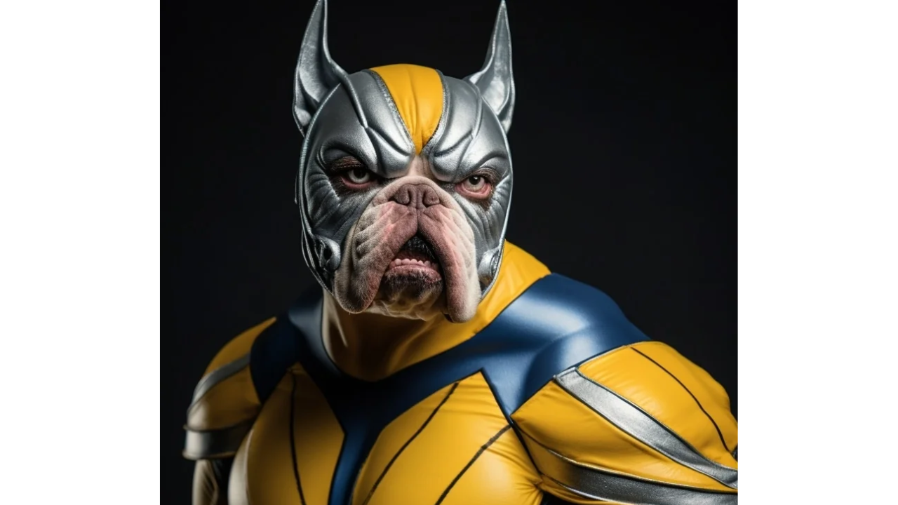 Wolverine (interpretado en cine por Hugh Jackman), conocido por su ferocidad y tenacidad, se convierte en un robusto bulldog. Este perro, con su apariencia ruda y naturaleza combativa, es el equivalente perfecto del mutante canadiense. Su expresión desafiante y musculatura imponente hacen justicia al espíritu indomable de Logan, mientras que sus pequeñas pero poderosas patas recuerdan las garras afiladas del héroe.