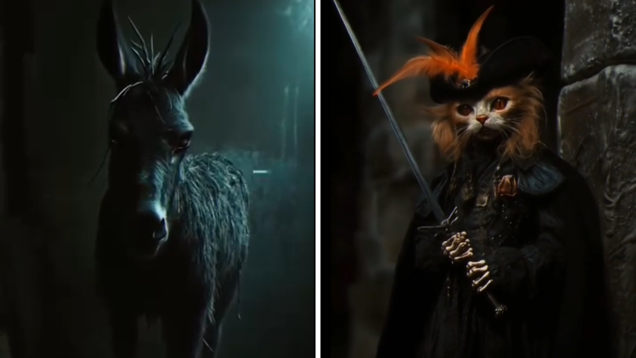 Burro, antes un compañero alegre y parlanchín, se transforma en un ser de ojos desorbitados y pelo enmarañado, con risas que resuenan en la oscuridad como un eco perturbador. Su cuerpo esquelético y alargado se mueve de manera errática, siempre susurrando secretos siniestros. A su lado, el Gato con Botas, ahora una criatura de ojos rojos brillantes, se oculta en las sombras con sus botas desgastadas y un sable oxidado, esperando el momento perfecto para atacar con una precisión mortal.