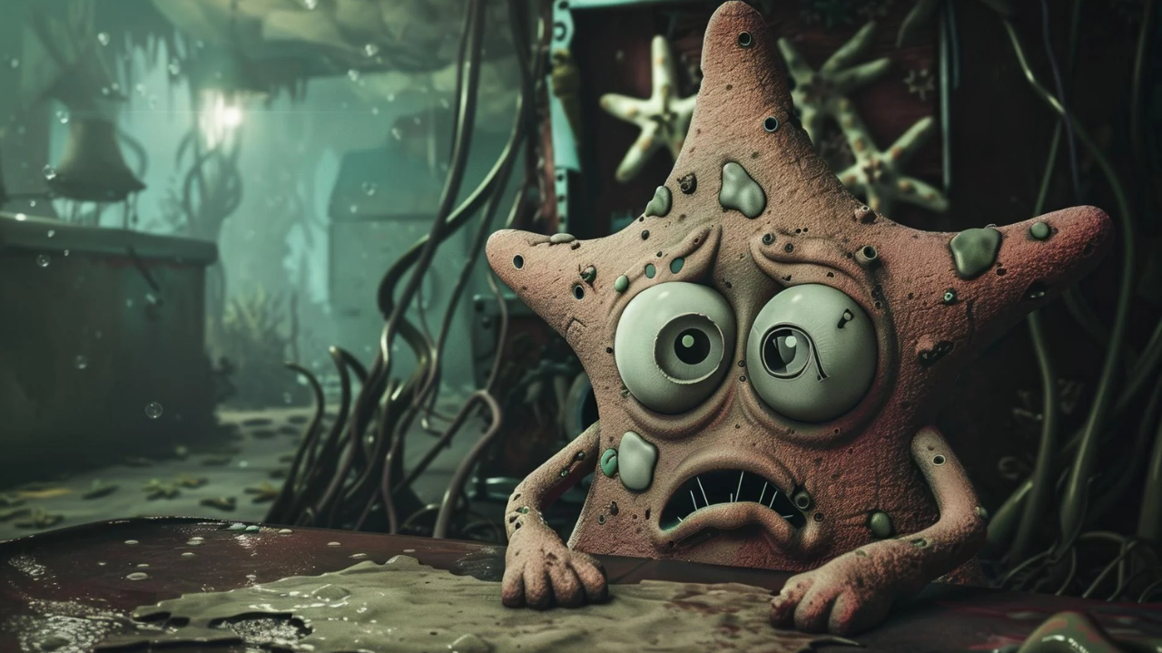 Patricio Estrella se vería como una criatura torpe y adorable, pero con un toque inquietante, similar a los personajes de Frankenweenie. Sus ojos transmitirían una extraña mezcla de ingenuidad y terror, mientras que su piel rosa se teñiría de un tono más apagado, casi grisáceo. Su característica personalidad perezosa y su comportamiento errático serían potenciados, convirtiéndolo en un personaje más perturbador, moviéndose lentamente por un fondo marino que parece estar congelado en el tiempo.