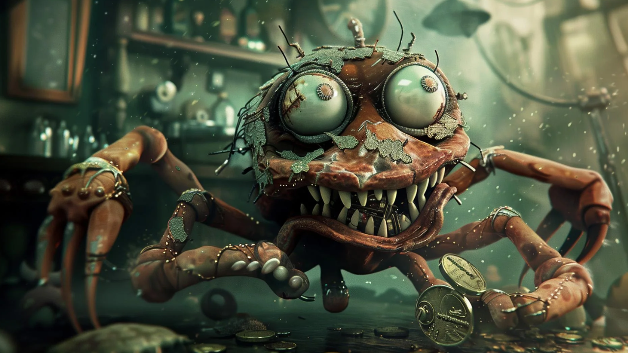 Mr. Krabs sería representado como una criatura aún más codiciosa, con un aspecto que recuerda a Beetlejuice con sus rasgos exagerados y su risa siniestra. Sus pinzas estarían más afiladas y su caparazón tendría un tono más oscuro, casi oxidado, mientras que sus ojos saltones transmitirían una mirada astuta y hambrienta. Su oficina en el Krusty Krab estaría llena de relojes que siempre marcan las tres de la tarde, en referencia a su obsesión por el dinero, y su risa resonaría como un eco inquietante por los pasillos de su restaurante.