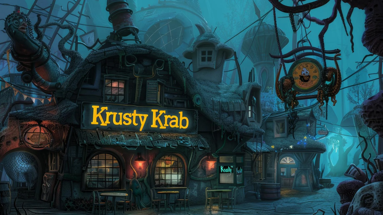 El Krusty Krab, en esta versión burtoniana, sería una siniestra taberna marina que recuerda a los extraños locales de Sombras tenebrosas. Sus paredes de madera vieja estarían carcomidas y cubiertas de algas oscuras, y las luces parpadearían constantemente, creando una atmósfera de misterio. Las mesas y sillas, retorcidas y asimétricas, darían la sensación de estar en un lugar que desafía las leyes del diseño tradicional, mientras el olor a cangreburgers podridas flotaría en el aire.