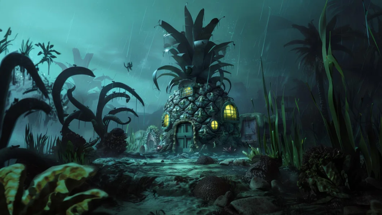 Bajo el lente gótico de Tim Burton, Fondo de Bikini se transformaría en un oscuro escenario al estilo de El cadáver de la novia. Este nuevo paisaje se asemejaría a un arrecife de coral en decadencia, con estructuras torcidas y vegetación marina sombría que parece cobrar vida. Las tonalidades pastel y brillantes de la caricatura original serían reemplazadas por sombras grises, azules opacos y toques verdes oscuros, creando un mundo submarino que recuerda al inquietante inframundo que Burton imagina en cada uno de sus filmes.