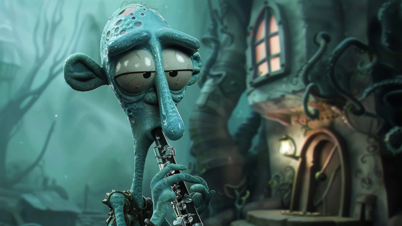 Calamardo se convertiría en un ser aún más sombrío, recordando la atmósfera lúgubre de El jinete sin cabeza. Su figura alargada, con tentáculos delgados y retorcidos, reflejaría su constante frustración y pesimismo. Sus ojos, profundos y cansados, transmitirían un desdén más pronunciado, mientras su clarinete, siempre desafinado, emitiría notas melancólicas que resonarían por todo el Fondo de Bikini, reforzando el ambiente lúgubre del lugar.