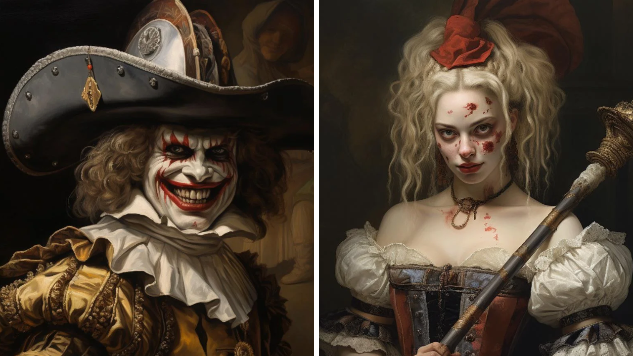 En este mundo medieval, Joker (Heath Ledger) aparece como un bufón infernal, con su sonrisa perversa, ropas opacas y una presencia tan aterradora como la de Saruman (Christopher Lee). Sus travesuras macabras y su retorcida visión del mundo lo convierten en una amenaza impredecible. A su lado, Harley Quinn (Margot Robbie), vestida como una juglaresa desquiciada, sigue cada uno de sus pasos con una lealtad perturbadora.