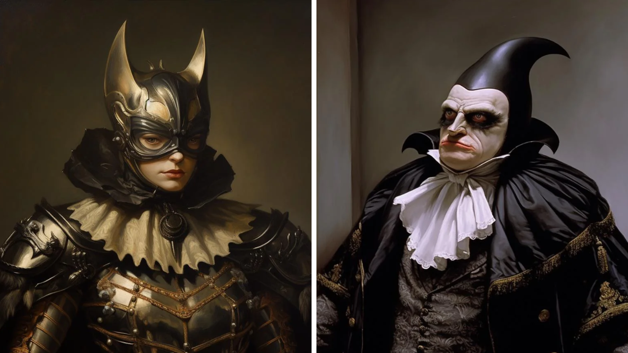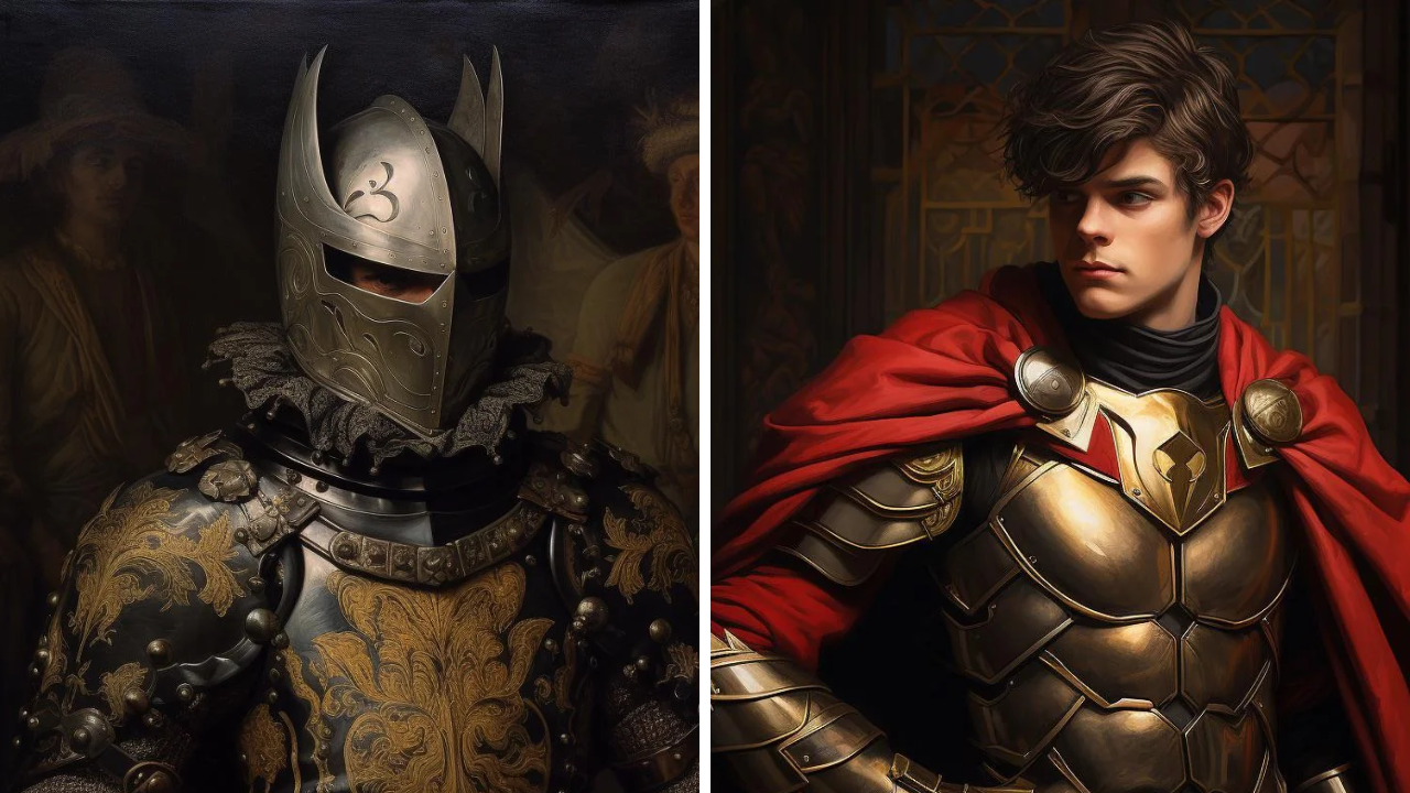 En la Tierra Media, Batman (Christian Bale) se erige como un caballero oscuro, envuelto en una imponente armadura negra, una figura implacable en el campo de batalla y un estratega astuto dentro de los círculos de la aristocracia. Junto a él, Robin (Chris O'Donnell) viste una armadura más ligera pero igualmente elegante, emulando a un escudero leal y ágil. Ambos combinan su linaje noble con su destreza como guerreros, como si fueran una versión alternativa de Aragorn (Viggo Mortensen) y Boromir (Sean Bean), con un profundo sentido del deber y el honor.