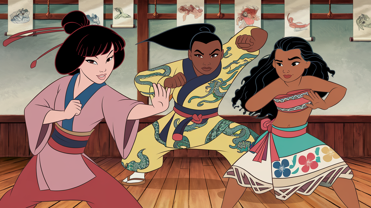 Con un poco más de técnica Mulán podría ser incluso una de las maestras para instruir disciplinas marciales junto a Ranma pues finalmente él acudió a China junto a su padre para perfeccionar sus habilidades. Junto a la guerrera vemos a Tiana de La princesa y el sapo y Moana listas para seguir las instrucciones y comenzar una pelea de entrenamiento.