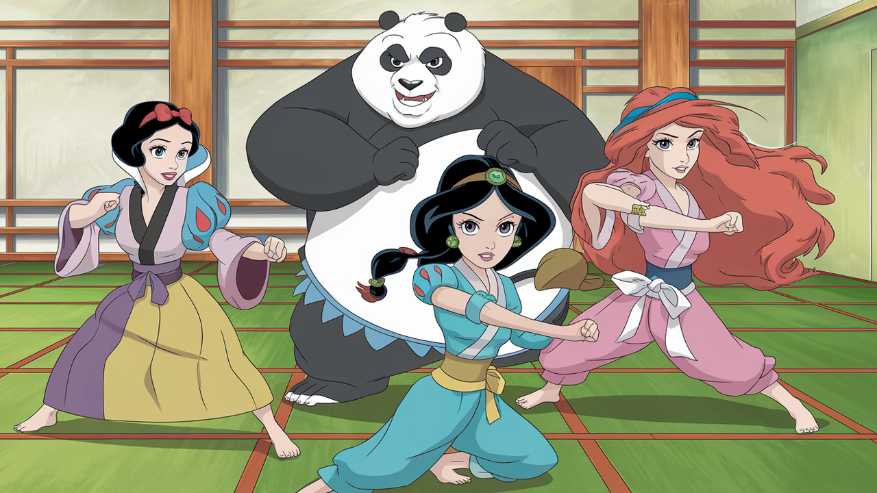 Para cerrar vemos a Blancanieves, la princesa Jasmín de Aladdín y a Mérida de Valiente en posición de guardia mientras son aconsejadas por Genma Saotome, el padre de Ranma, con su apariencia de Panda. Las princesas combinaron el estilo clásico de sus vestidos con un atuendo mucho más cómodo para la batalla.