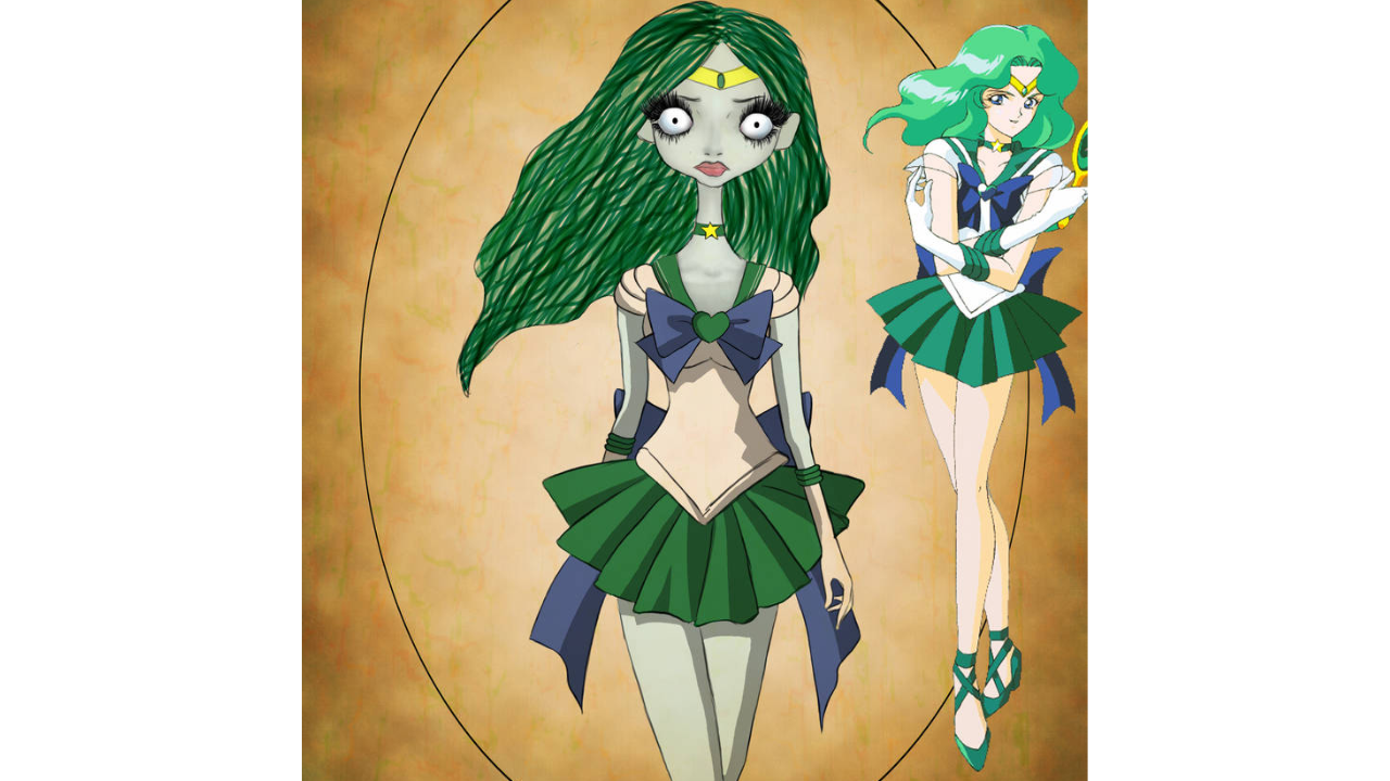 El elegante verde agua de Sailor Neptune se vería transformado en un tono más profundo y enigmático, como las profundidades del océano que representa. En el universo de El cadáver de la novia, su gracia y poder no perderían brillo, pero estarían acompañados por una melancolía que emerge de su sabiduría y conexión con las fuerzas más misteriosas del universo. Su serenidad exterior escondería emociones turbulentas, reflejando su constante lucha por mantener el equilibrio en su vida.