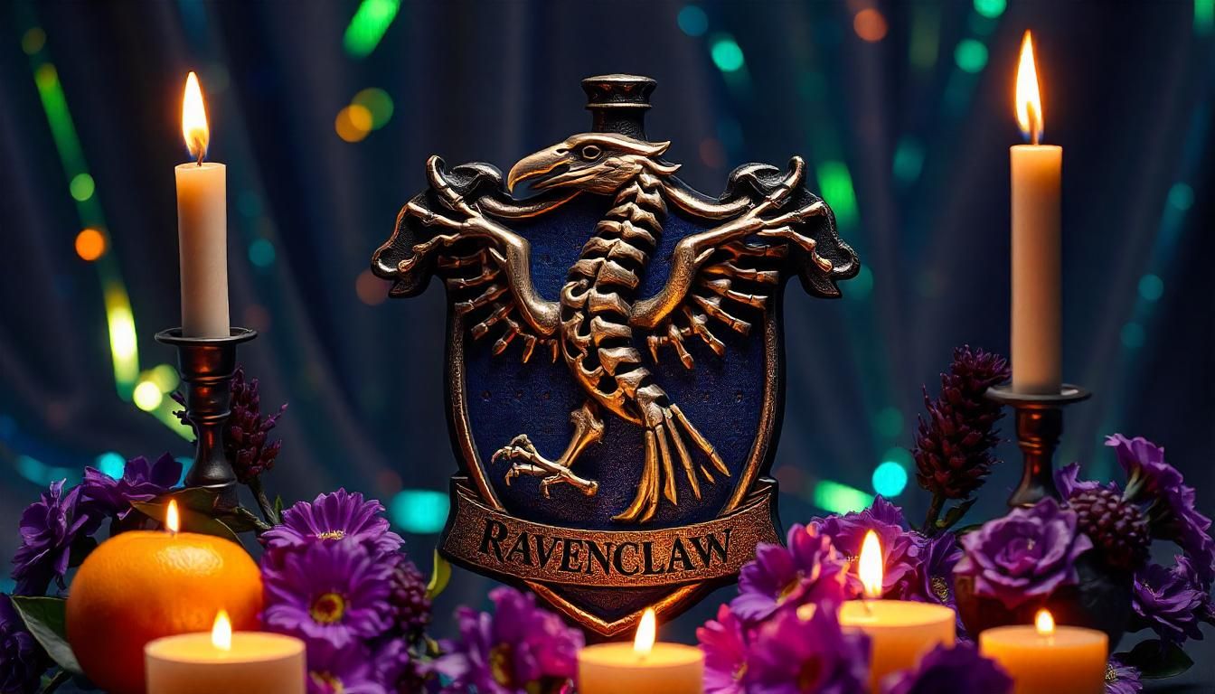 En cuanto a la casa de Luna Lovegood al centro del escudo azul luciría el esqueleto de un águila. Asimismo, para alimentar el ingenio, aprendizaje y sabiduría de los miembros de Ravenclaw al escudo le rodean veladoras, mandarinas y flores moradas que podrían sustituir a la celosia que se acostumbra poner en nuestro país (esa flor morada que tiene la apariencia de un cerebro aterciopelado).