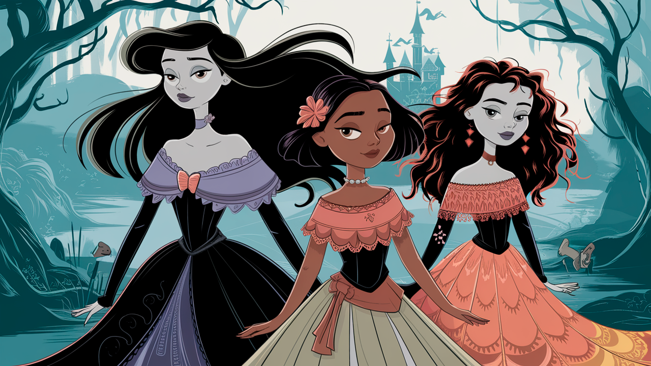 Con miradas curiosas enmarcadas por las lineas debajo de sus ojos al estilo de Victor y Victoria en El cadáver de la novia, las tres princesas pasearían juntas por un oscuro bosque con sus vestidos victorianos.