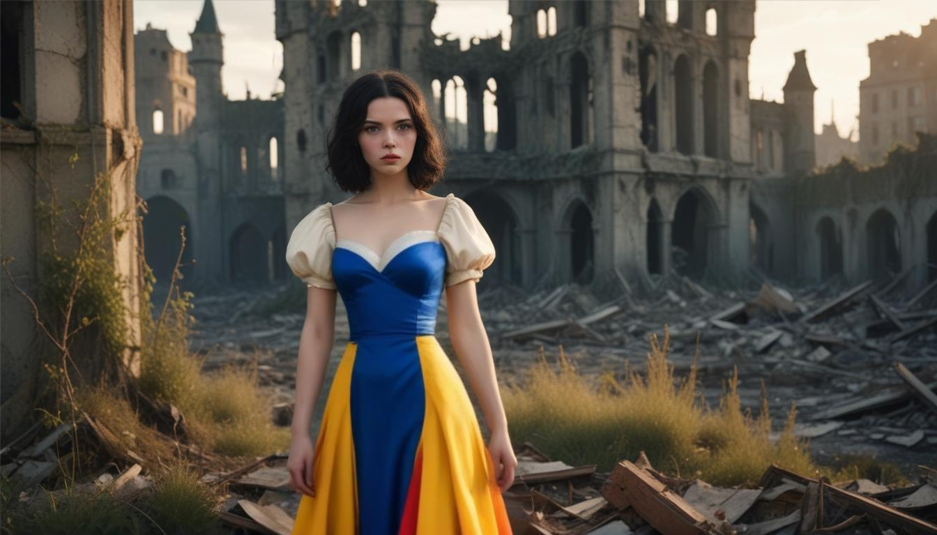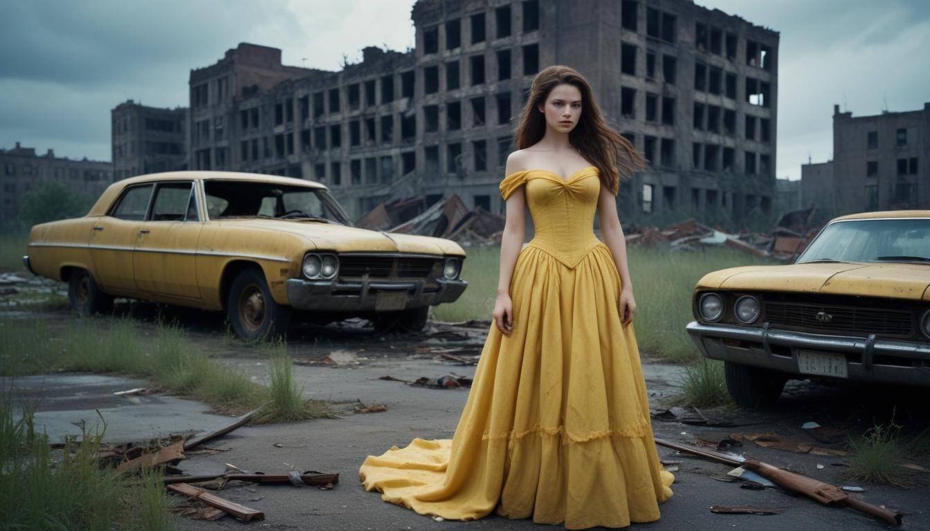 Con su vestido amarillo arrastrando por las calles vacías Bella es una de esas princesas que recién entró al mundo de aquella película. Tras de ella, un edificio en ruinas se alza como una opción para buscar refugio.