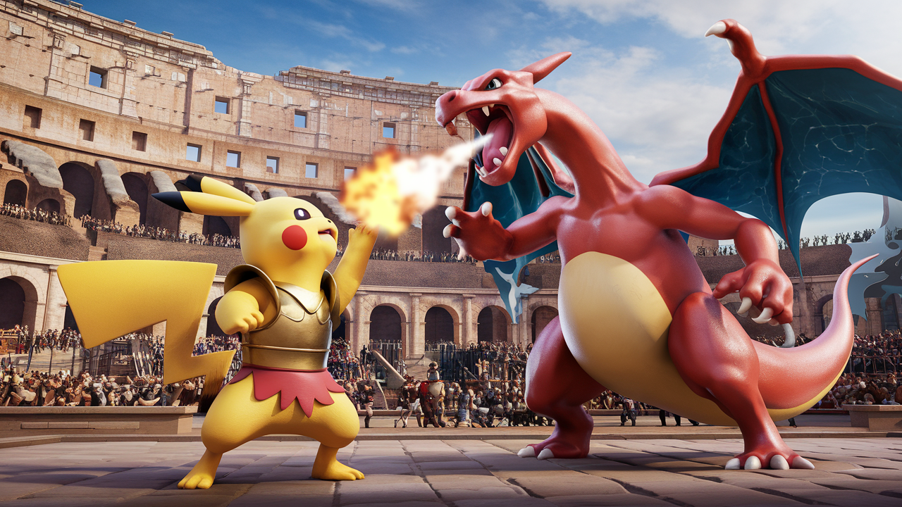 El ratón eléctrico se puso la armadura de Russell Crowe para una de las batallas más peligrosas que ha enfrentado en su vida. Pikachu tendrá que combatir a Charizard, quien no sólo es peligroso, sino que hasta ahora se ha mantenido invicto como el mejor gladiador de toda Roma. ¿Quién ganará este encuentro digno de ser dirigido Ridley Scott?