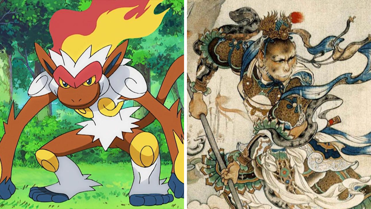 Infernape está inspirado en Sun Wukong, el Rey Mono, protagonista del clásico chino Viaje al Oeste. Este personaje mitológico es un mono humanoide con postura erguida, pelaje y cola, conocido por su destreza en el combate. Infernape, uno de los compañeros más poderosos de Ash en el anime, presenta un diseño visual que claramente recuerda a Sun Wukong, con detalles dorados que le dan un aire imponente.