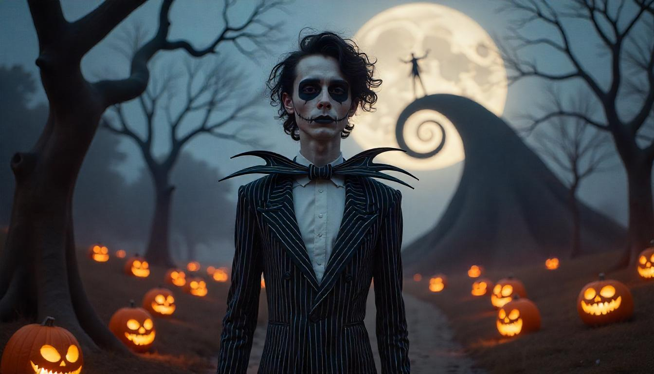 Su estética inconfundible, marcada por escenarios sombríos, figuras estilizadas y un toque de ternura melancólica, encajaría perfectamente con el magnetismo de Chalamet. Estas imágenes le dan vida a esta combinación imaginaria, mostrando cómo podría lucir una versión live-action de Halloween Town con Timothée en el papel del Rey Calabaza.
