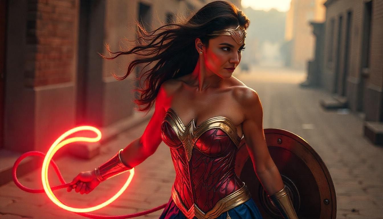 La Mujer Maravilla de Higareda también haría gala de su fuerza e ideales cuidando de la ciudad. Aquí parece estar recorriendo las calles con su lazo de la verdad preparado en caso de que sea necesario atrapar a algún infractor de la ley.