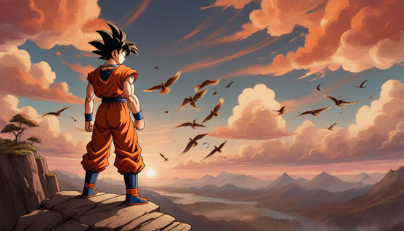 Un grupo de colinas se observan a la espalda de Gohan, guerrero que tal vez iniciaría una gran travesía por las cordilleras para entrenar su cuerpo y mente. Para acompañarlo, una gran puesta de Sol marcaría el inicio del final de otro día de entrenamiento.