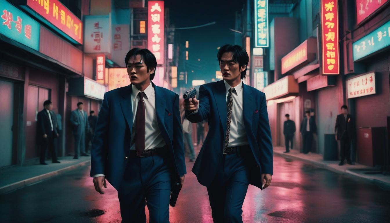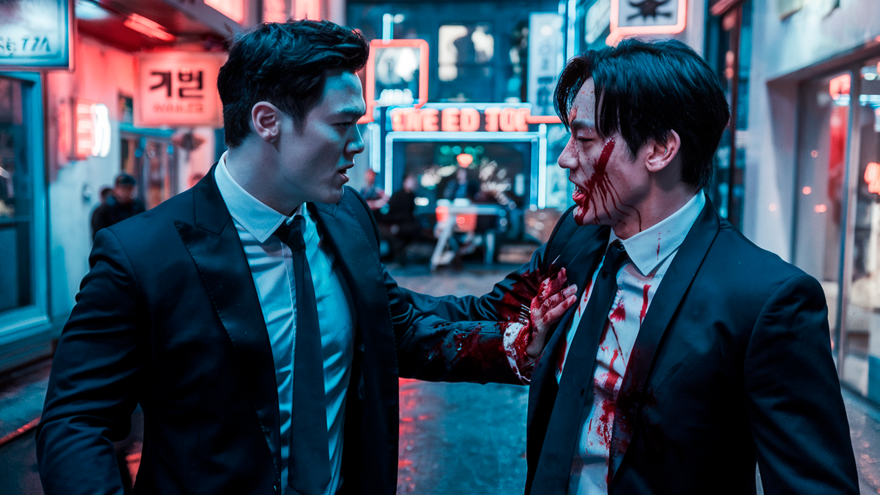 No podrían faltar un par de hombres trajeados luciendo imparables como si de Pulp Fiction se tratara. Pero también sería necesario agregar luces neón para el toque vibrante de Tarantino en Seúl.