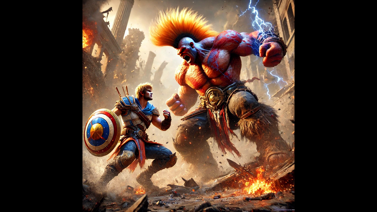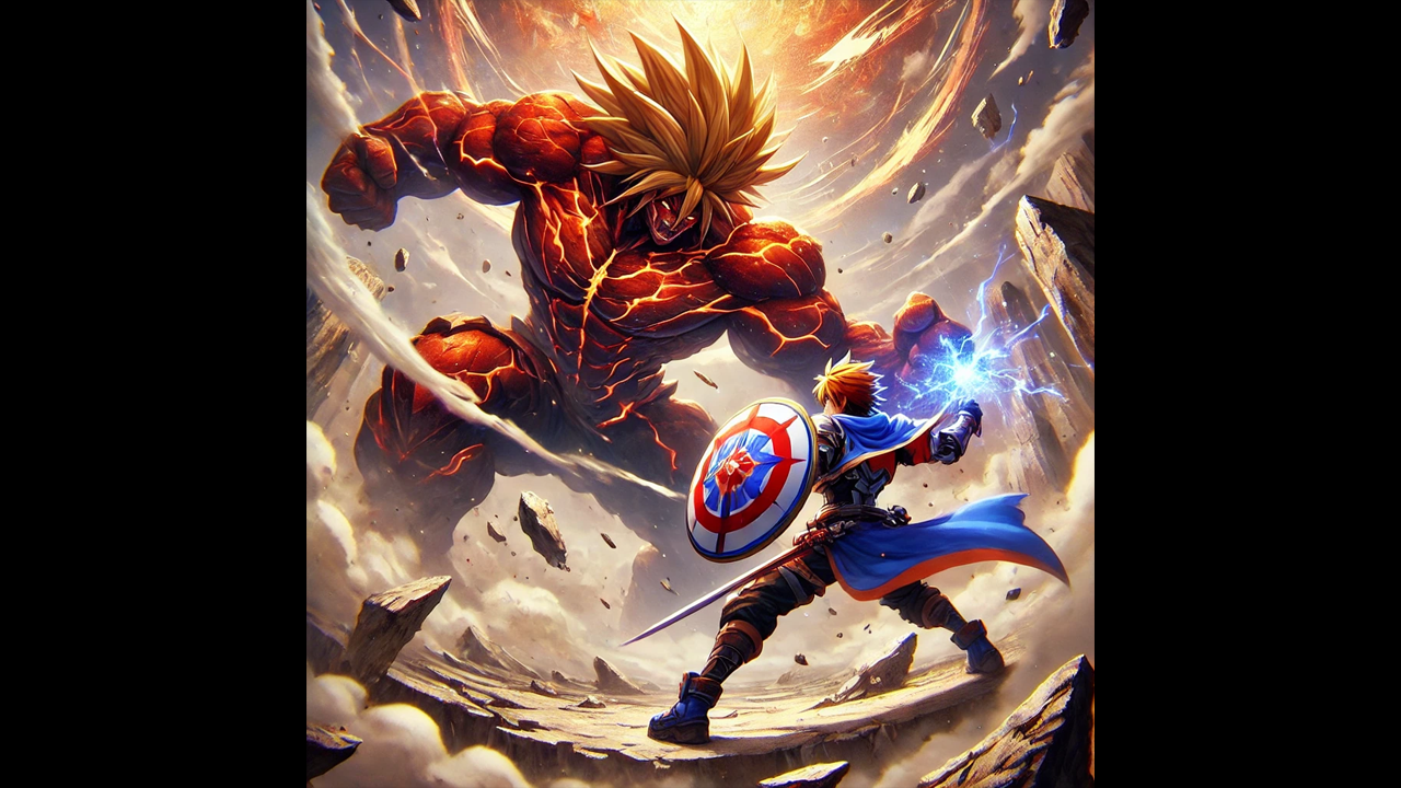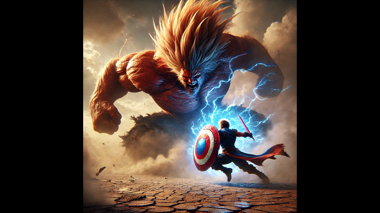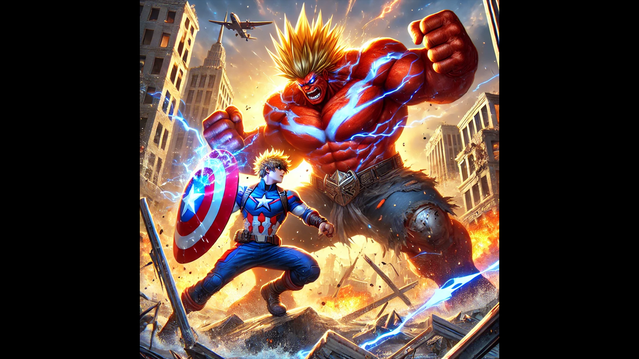 Los rascacielos estarían derrumbándose mientras estos dos titanes se enfrentan. Red Hulk lanzaría un puñetazo que destruiría edificios a su paso, mientras Goku trataría de bloquear el impacto con el escudo del Cap. Una onda expansiva llena de energía se liberaría con cada golpe, que haría temblar las calles y ocasionaría un fuego que consumiría lo que queda de la ciudad.