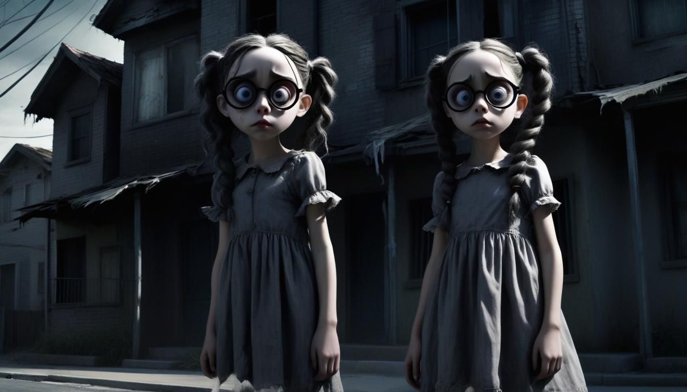 Como un par de gemelas con gafas, trenzas y un par de miradas afligidas es como Chilindrina y Popis harían su debut en esta versión más oscura de la serie. Juntas le darían un toque inquietante a la historia moviéndose casi a la par o completando las frases de la otra.