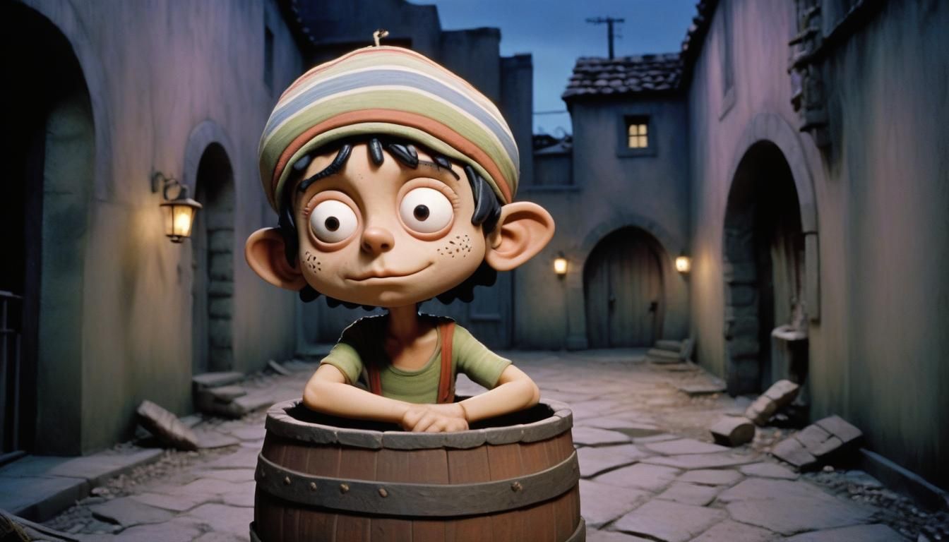 En cuanto a el Chavo, así se vería asomándose desde su conocido barril en la vecindad alumbrada por la luz de tenues faros y la noche cayendo cada vez más sobre el lugar.