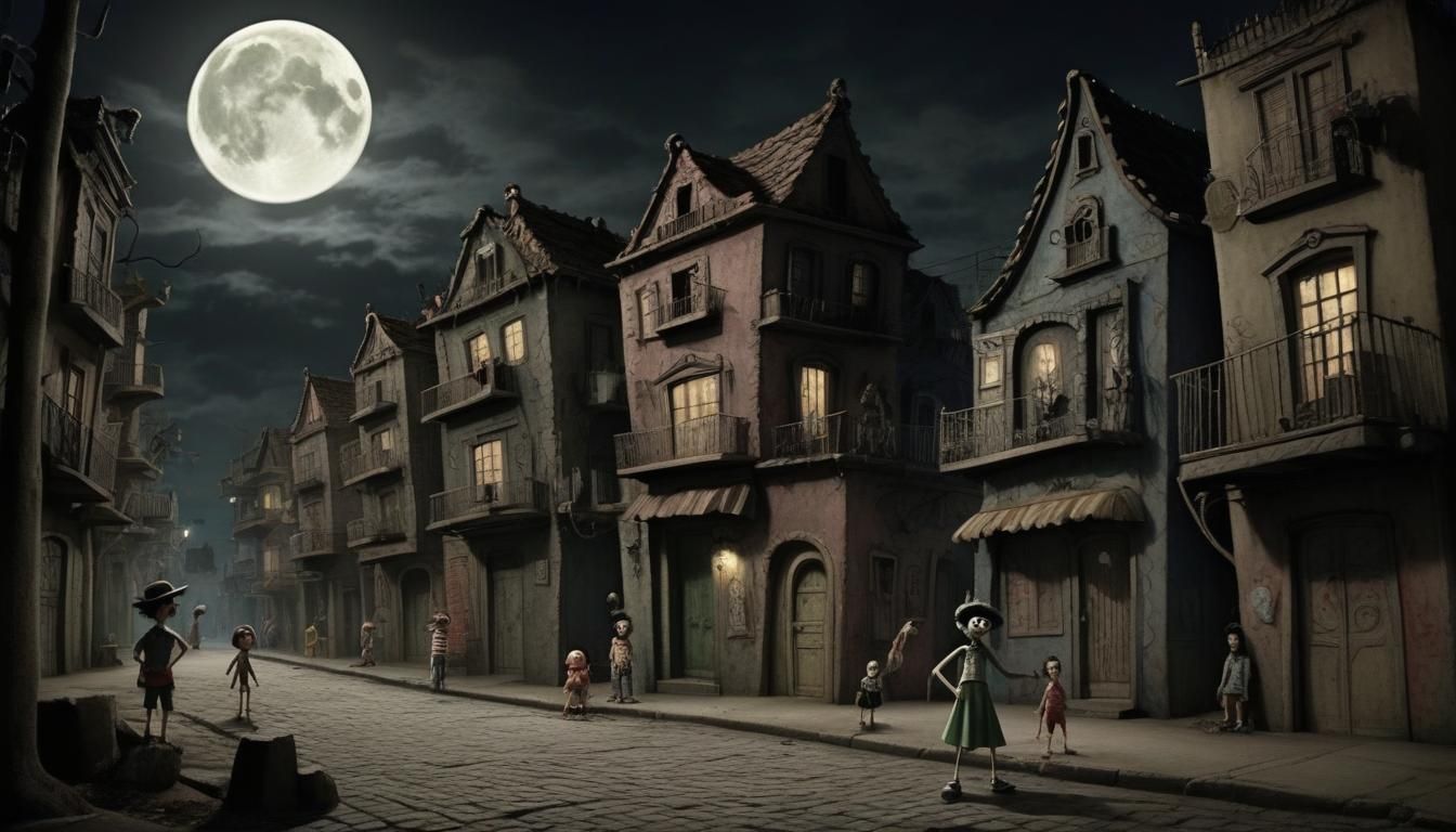 Con una gran Luna llena, aunque sin eclipse, así se vería la vecindad del Chavo en un barrio de casas oscuras, con techos afilados y figuras alargadas recorriendo la calle.