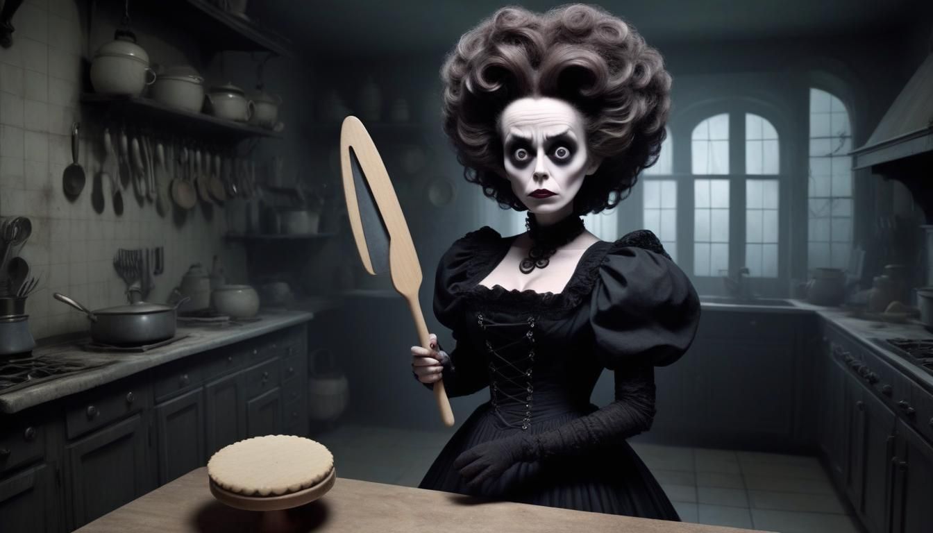 Después de llevar por tanto tiempo los tubos para rizo en su cabello, sabríamos que este es el resultado que Doña Florinda buscaba para su look que va perfecto con su vestido negro victoriano. Su casa, muy similar al estilo de la gran mansión en Sombras tenebrosas, tendría una amplia cocina en la que estaría preparando alguna merienda con un extraño aditamento en la mano.