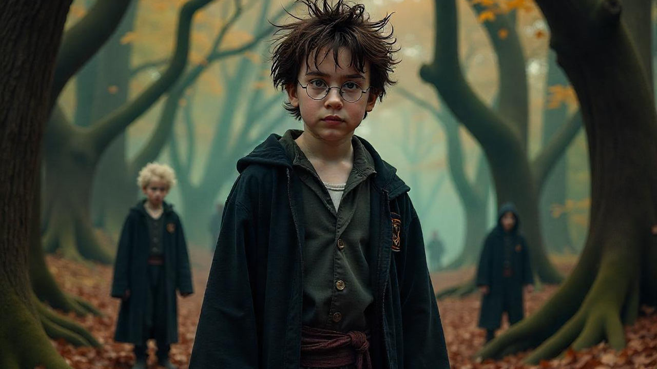 En esta versión de Harry Potter, el joven mago tendría un aspecto más lúgubre, con ojos llenos de melancolía y una expresión enigmática. Lo veríamos deambulando por el Bosque Prohibido en pleno día, rodeado de árboles torcidos y criaturas extrañas que parecen sacadas de El Extraño Mundo de Jack.