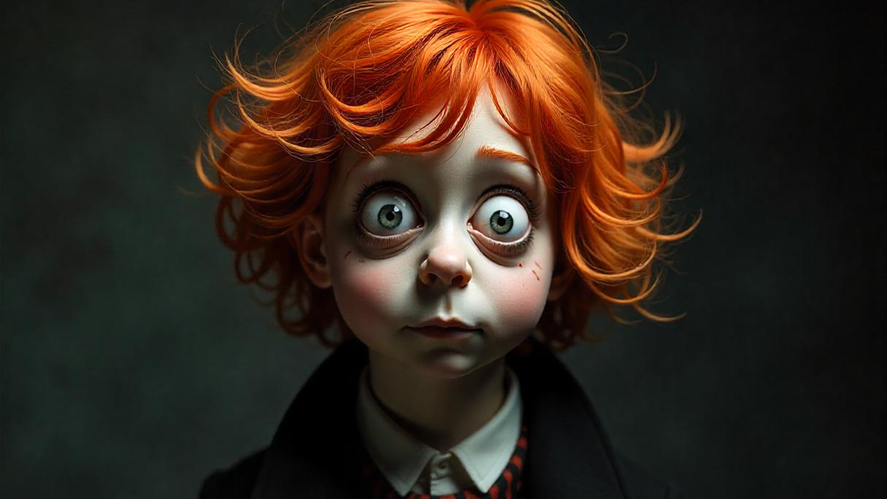 Ron Weasley tendría un diseño inspirado en Big Eyes, con ojos enormes y expresivos que reflejarían su asombro y constante estado de alerta. Su cabello rojo sería de un tono vibrante e intenso, casi como si brillara bajo la luz de la luna. Con una expresión de sorpresa y miedo, Ron parecería un personaje de cuento gótico.