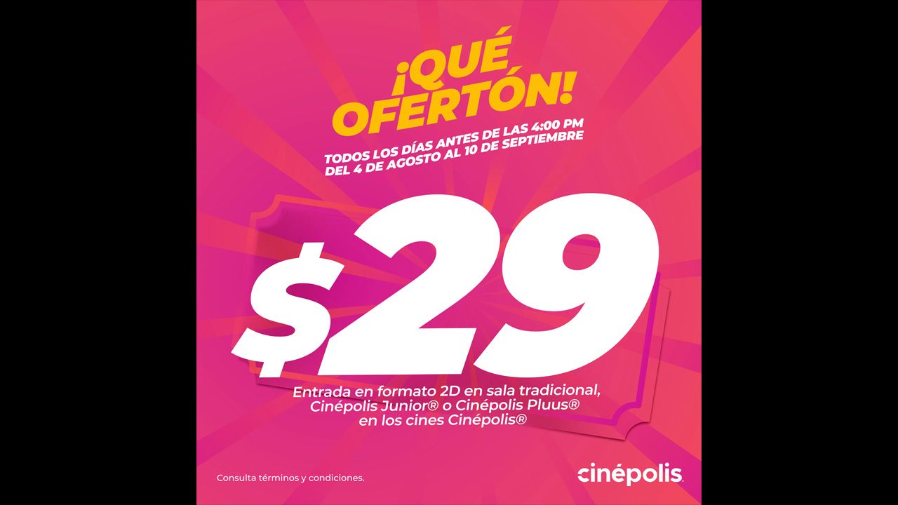 La promo está buenísima y va a estar vigente del 4 de agosto al 10 de septiembre de 2025 y tiene algunos detalles que debes tomar en cuenta. Para aprovechar el precio de 29 pesos, tienes que ir a funciones que empiecen antes de las 4 de la tarde. Además, aplica en varios formatos: salas tradicionales, Cinépolis Junior, Macro XE, y Cinépolis Pluus. Y por si fuera poco, puedes comprar tus boletos en la taquilla de siempre, en la página web, desde la app, en los kioscos o en las taquillas automáticas.