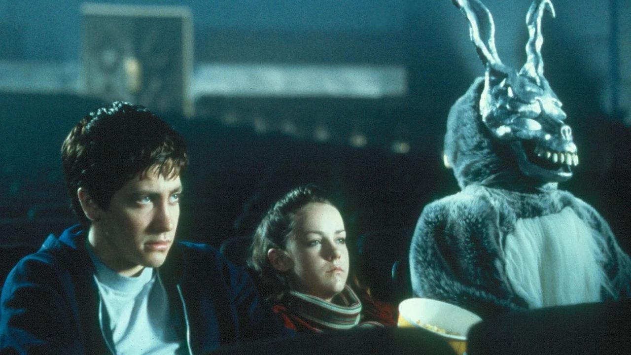 En la inquietante Donnie Darko, Donnie (Jake Gyllenhaal) asiste a una función de cine junto a Gretchen (Jena Malone), pero la proyección pasa a un segundo plano cuando aparece Frank, el enigmático hombre con disfraz de conejo. La atmósfera cargada de misterio se intensifica cuando Donnie lo confronta, preguntándole por qué lleva puesto ese traje de conejo, a lo que Frank responde con una réplica tan absurda como perturbadora: “¿Y tú por qué llevas ese estúpido traje de hombre?”. Esta conversación, sostenida en medio de la penumbra de la sala, subraya el carácter surrealista del relato.