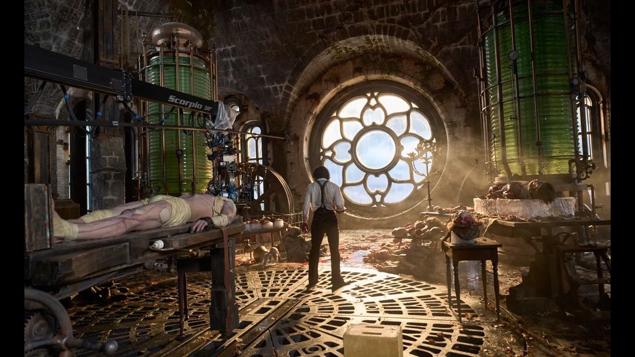 Una de las fotografías más reveladoras muestra el laboratorio completo de Frankenstein: mesas de disección y una iluminación espectral que parece salida directamente de una pintura gótica. Cada objeto fue diseñado al detalle, manteniendo la estética artesanal que caracteriza a Del Toro.