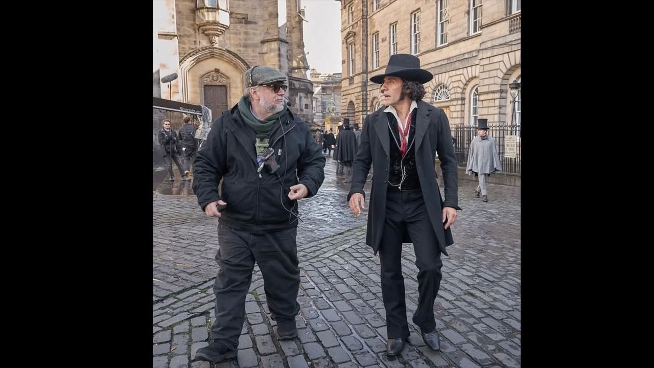 En una toma curiosa, Del Toro y Oscar Isaac, caracterizado como Frankenstein, caminan juntos por una calle del set. La imagen es tan surrealista como hermosa: el director y el científico, paseando tranquilamente en una calle de hace un par de siglos.