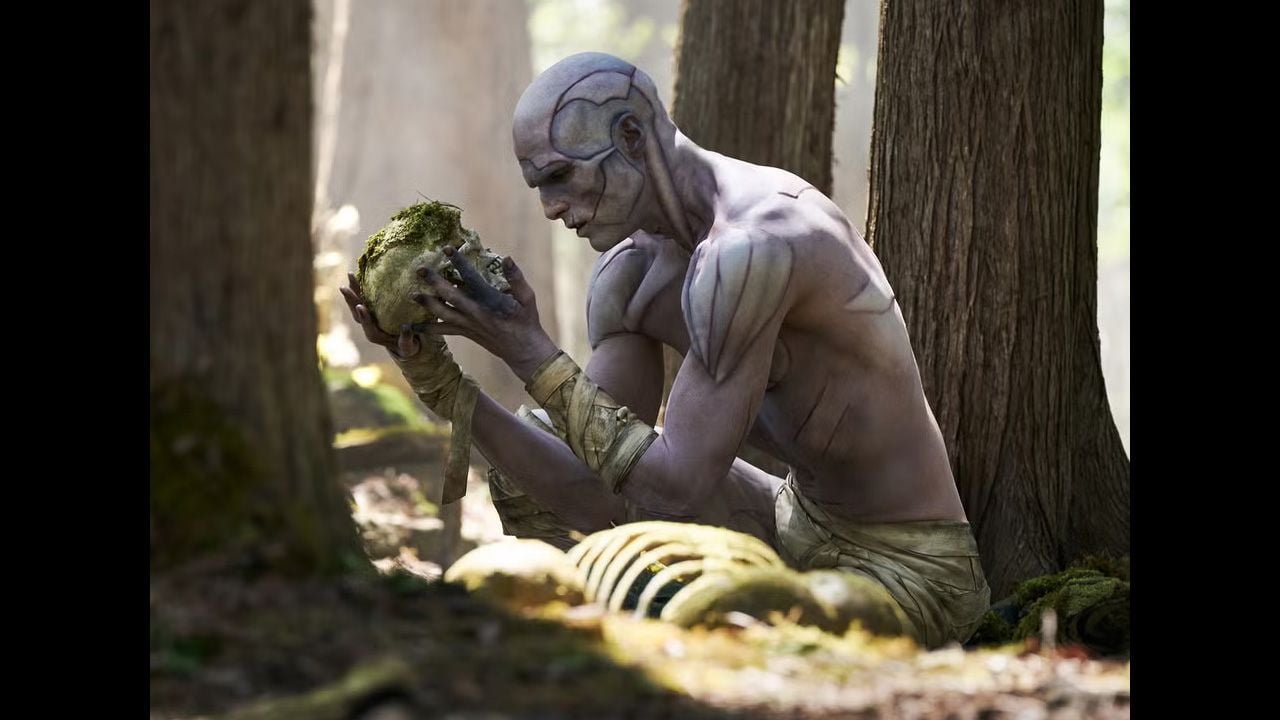Otra toma muestra a Elordi sosteniendo un cráneo en medio de un bosque, en plena escena. La composición parece una pintura: la criatura contemplando la muerte, bajo un tono poético que recuerda por qué Del Toro es un artista del dolor y la belleza.