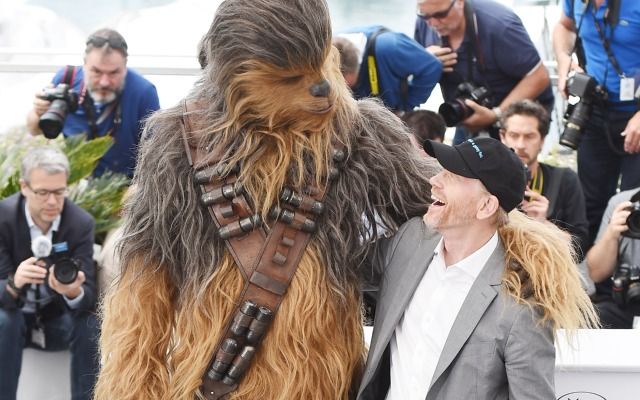 Sin duda el más fotografiado en el photo call fue Chewbacca, el único miembro del elenco original de la cinta de 1977 que aquí felicita al director Ron Howard por su logro.