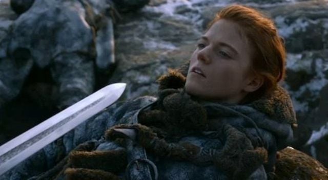 Tras el ataque de los salvajes al muro, Ygritt es herida por un vengativo y joven miembro de la Night Watch y muere en brazos de Jon. En la vida real el par de actores sigue negando que exista algo entre ellos.