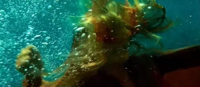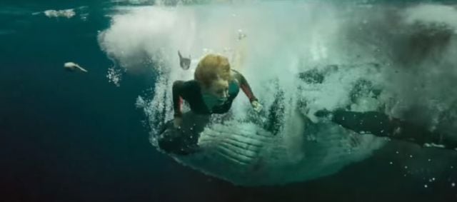 Además de morderle una pierna la avienta contra un arrecife, pero ella logra nadar hasta el cadáver de una ballena que flota en el agua...