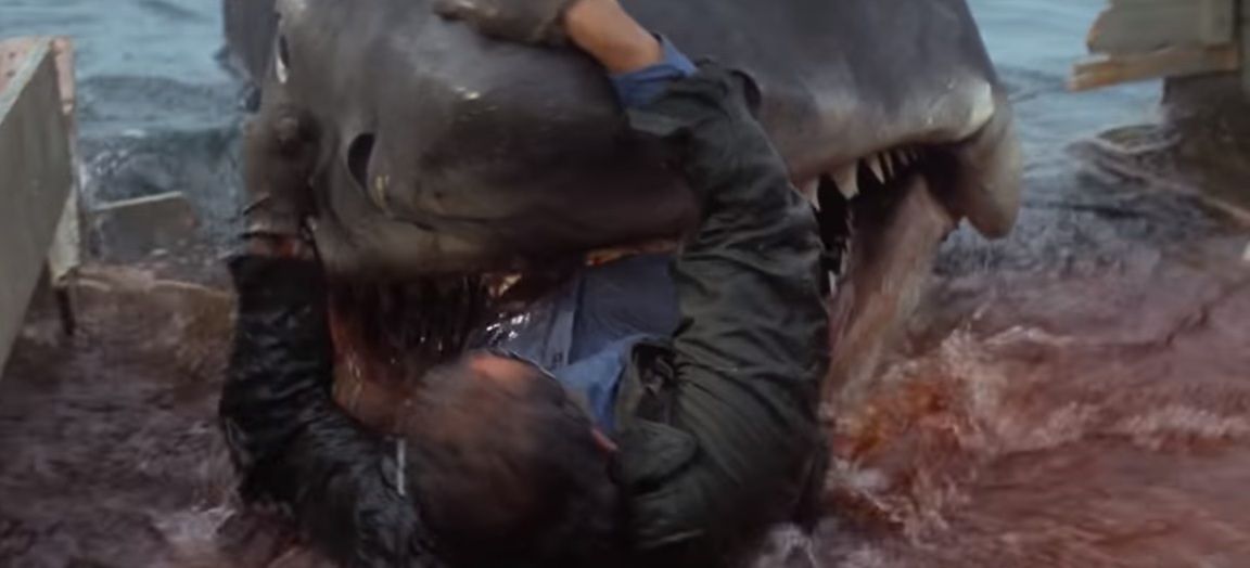 Brody no logra sostener a Quint quien se desliza sin remedio directo a las fauces del tiburón, que comienza a comérselo vivo mientras el agua se pinta de rojo. Horrible.