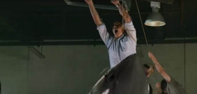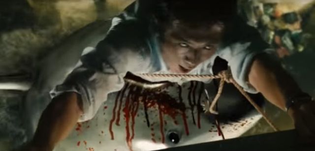 Pero el tiburón voltea al animal muerto volviéndola a lanzar al agua. Los 200 metros que Blake tienen que recorrer nadando a toda velocidad para alcanzar la playa, son los más largos y angustiantes de la pantalla grande.