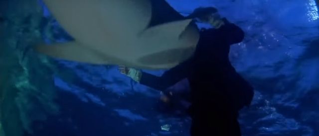 Un tiburón gigante sale sorpresivamente del agua para devorarlo ante la estupefacta mirada de sus colaboradores, y del público en las butacas.
