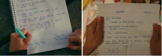 Si son muy observadores o de plano tienen vista de halcón, pueden notar que hay al menos hay dos versiones del contrato entre Peter y Lara Jean. Es fácil verlo por la manera en que las palabras Ski Trip están escritas.