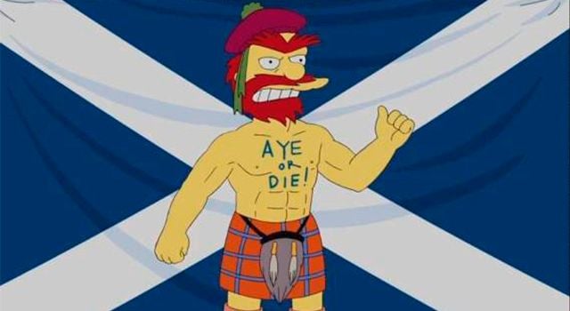 Y qué decir de los escoceses que están representados por un conserje de primaria, con muy poco razonamiento, musculoso, inadaptado y senil, ¿para cuándo la queja?