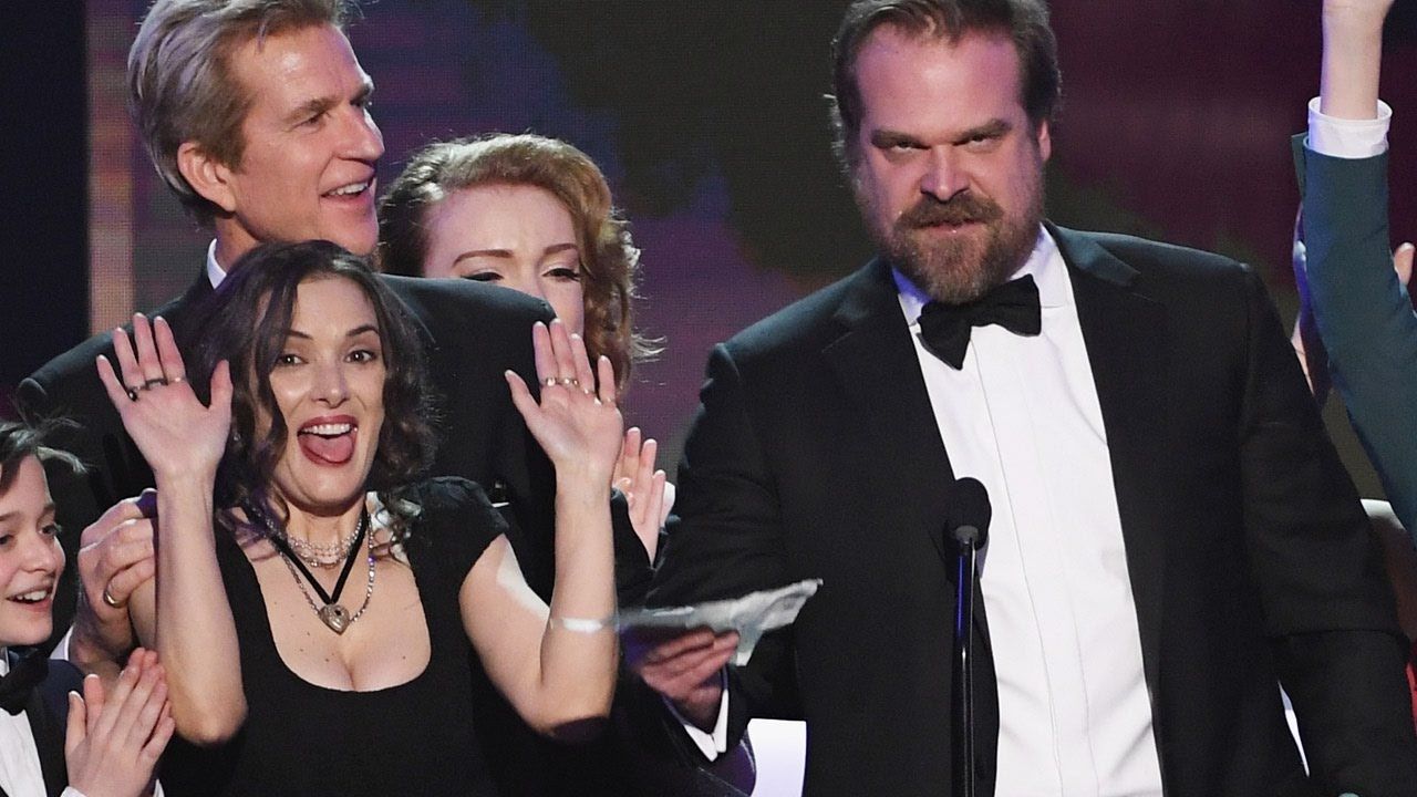 Winona Ryder robó la atención de los SAG por los gestos exagerados que hizo en el escenario cuando su colega de Stranger Things, David Harbour aceptaba el premio por el equipo.