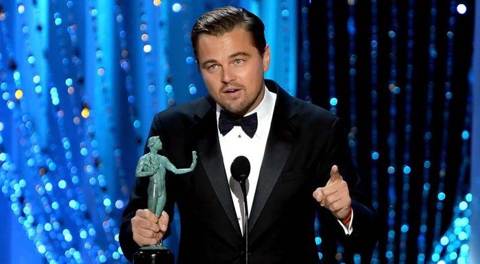 Leo ganó como mejor actor por El Renacido y recibió una ovación de pie. Dio las gracias a sus compañeros actores porque el premio provenía precisamente de todos ellos.