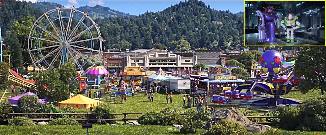 El juego morado con rojo y amarillo en el parque de diversiones, nos recuerda al malvado emperador Zurg, conocido rival de Buzz Lightyear en Toy Story 2.