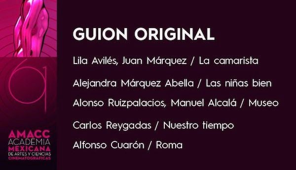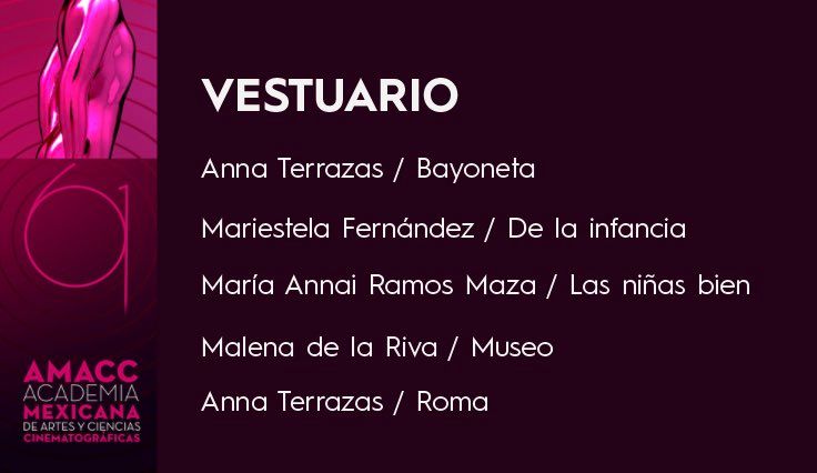 Pero Cas no es la única doblenominada: Anna Terrazas, que estuvo nominada el año pasado por Los adioses, repite con Bayoneta y Roma. También Tomás Barreiro tiene doble nominación por la estupenda música de Las niñas bien y Museo. Y Alejandro de Icaza, Jaime Baksht y Michelle Couttolenc en sonido.