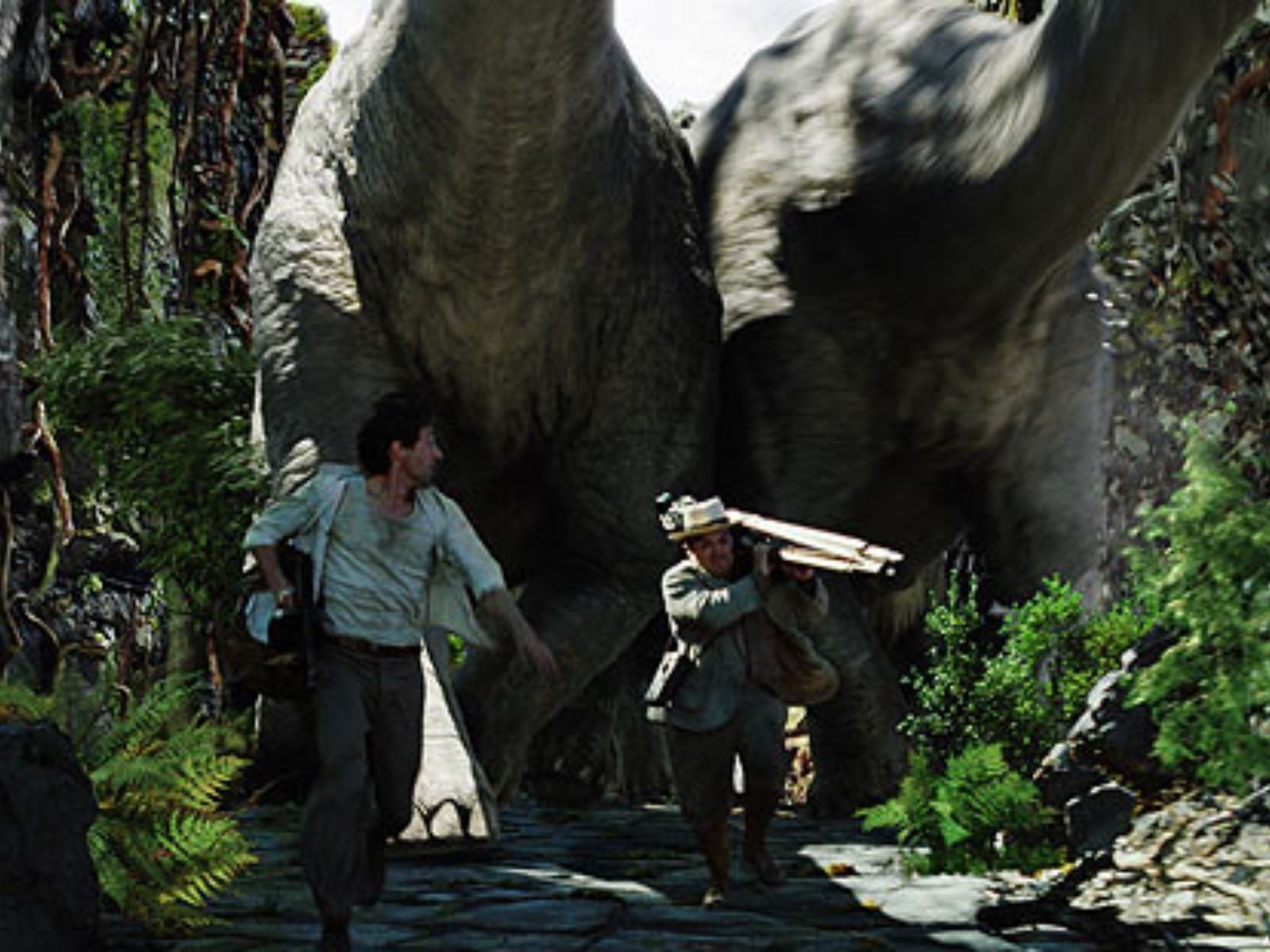 El remake de Peter Jackson del clásico monstruo muestra a los personajes atrapados en una estampida de dinosaurios y, aunque la película es buena, su edición se vuelve mediocre por el obvio uso de la pantalla verde.