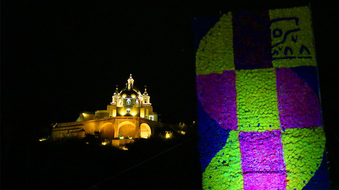 Con esta nocturna perspectiva, la icónica iglesia de Nuestra Señora de los Remedios se posa el logotipo oficial del Festival de cine de San Andrés Cholula.